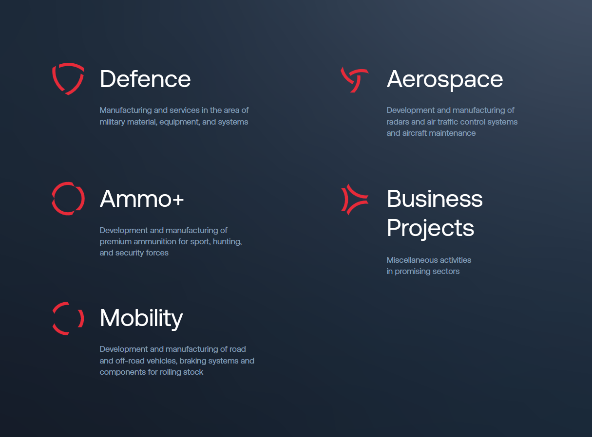 CSG’s product portfolio is very broad, and the Group’s organizational structure corresponds to this. CSG’s companies are organized into divisions, which also represent the main pillars of the Group’s business: Defence, Ammo+, Mobility, Aerospace, and Business Projects. Each division has its own management, which coordinates the development, production, and business activities of the member companies. This lets them implement complex projects and create synergies.
